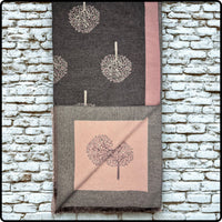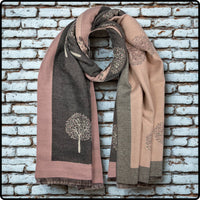Tree of life print scarf on cashmere mix with tassels in Pink Charcoal-SCTP