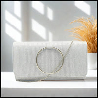 Introducing the Flora Evening Bag in luxurious silver with dazzling silver ring detail. Transform your evening look with this glamorous clutch, complete with a detachable chain for versatility. Plus, it offers plenty of room for all your essentials.