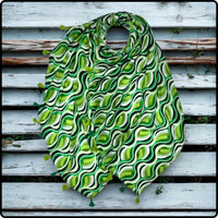 Wrap yourself in nostalgic charm with this eye-catching scarf, featuring vibrant retro-inspired swirl wave patterns in striking green tones. The playful design instantly elevates any outfit, adding a pop of colour and personality to your everyday look. Finished with decorative tassels at each end, this piece combines vintage flair with modern style.